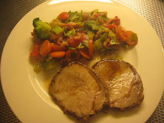 | Toen ik de foto nam, bij aanvang van de maaltijd, wist ik nog niet dat ik zou gaan zwichten voor die geurige biologische rijst die er op tafel stond, bereid voor mijn disgenoot. |